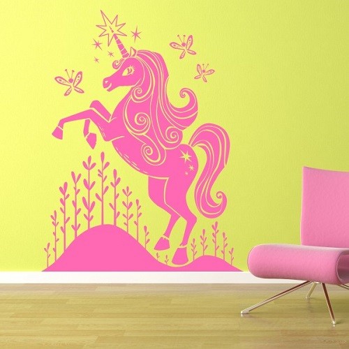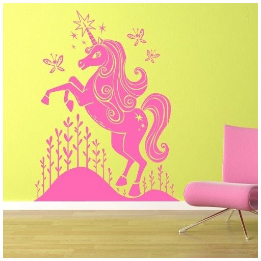 Ágaskodó unikornis pillangókkal, gyerekszoba falmatrica