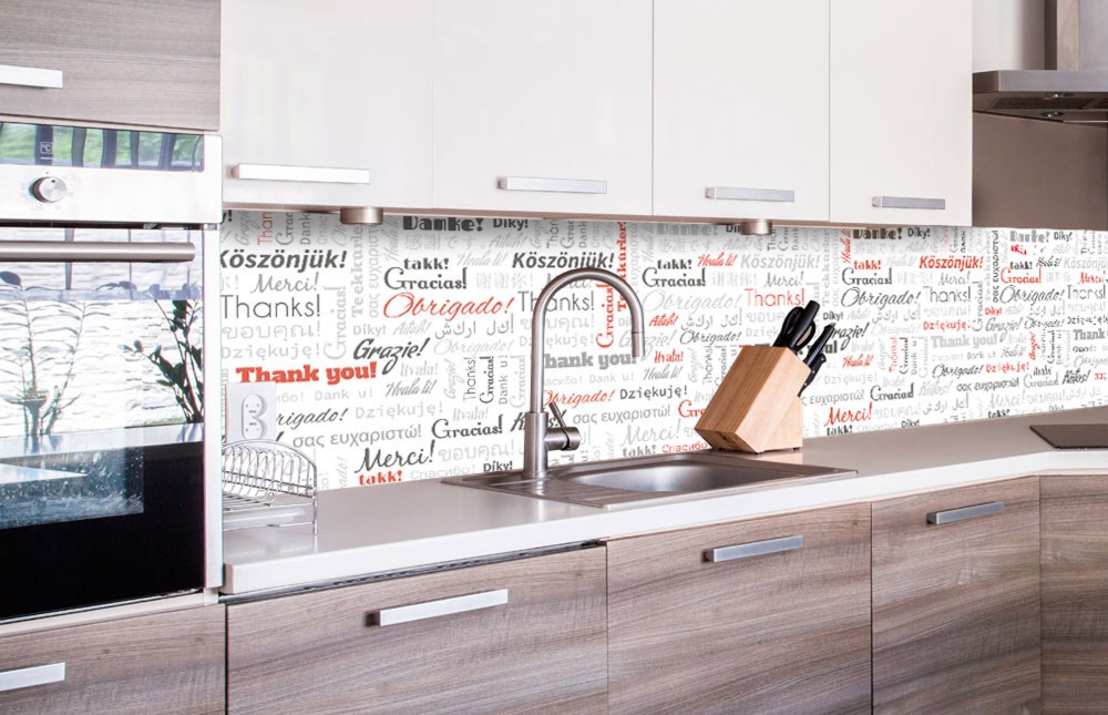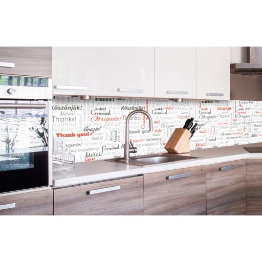 Köszönjük feliratok, konyhai matrica hátfal, 260 cm