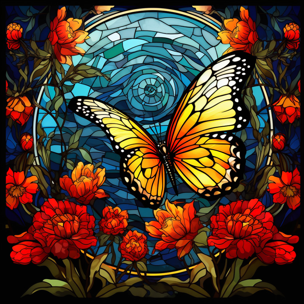 Pillangó a piros virágokon, ólomüveg hatású ablakmatrica