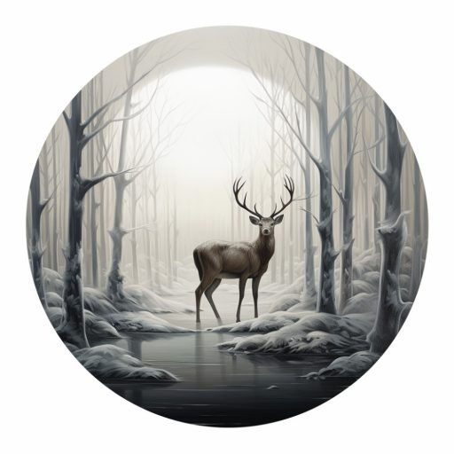 "> Szarvas sétál a befagyott patakon, üveggömb hatású ablakmatr
