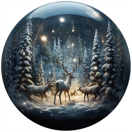 "> Szarvasok a csillagfényes téli erdőben, üveggömb hatású abla