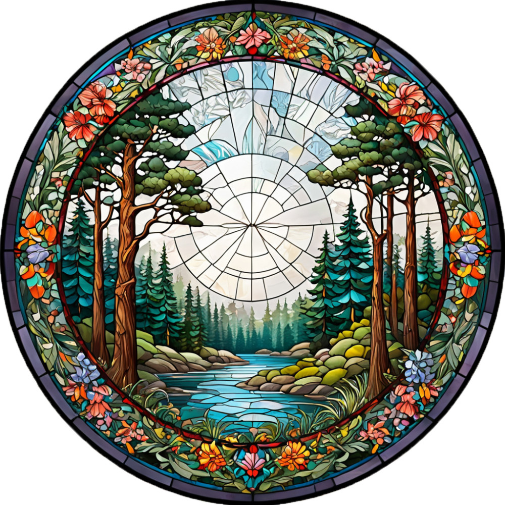 Zöld fenyőerdő folyóval, ólomüveg hatású ablakmatrica