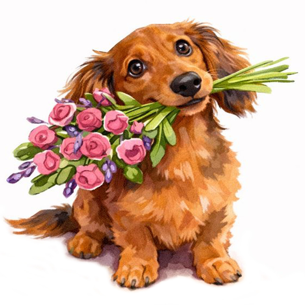 Virágcsokrot tartó kutyus, akvarell sztatikus ablakmatrica