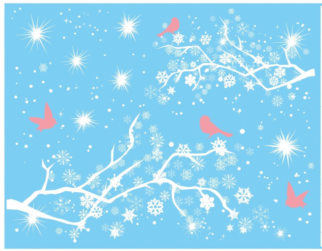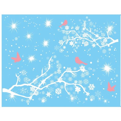 Rózsaszín madárkák a csillogós havas ágakon, sztatikus ablakmatrica